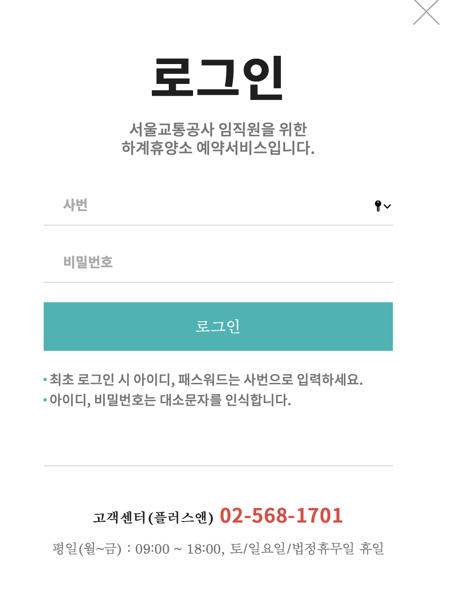 사번찾기 로그인 서울교통공사 임직원을 위한 하계휴양소 예약서비스입니다. 닫기