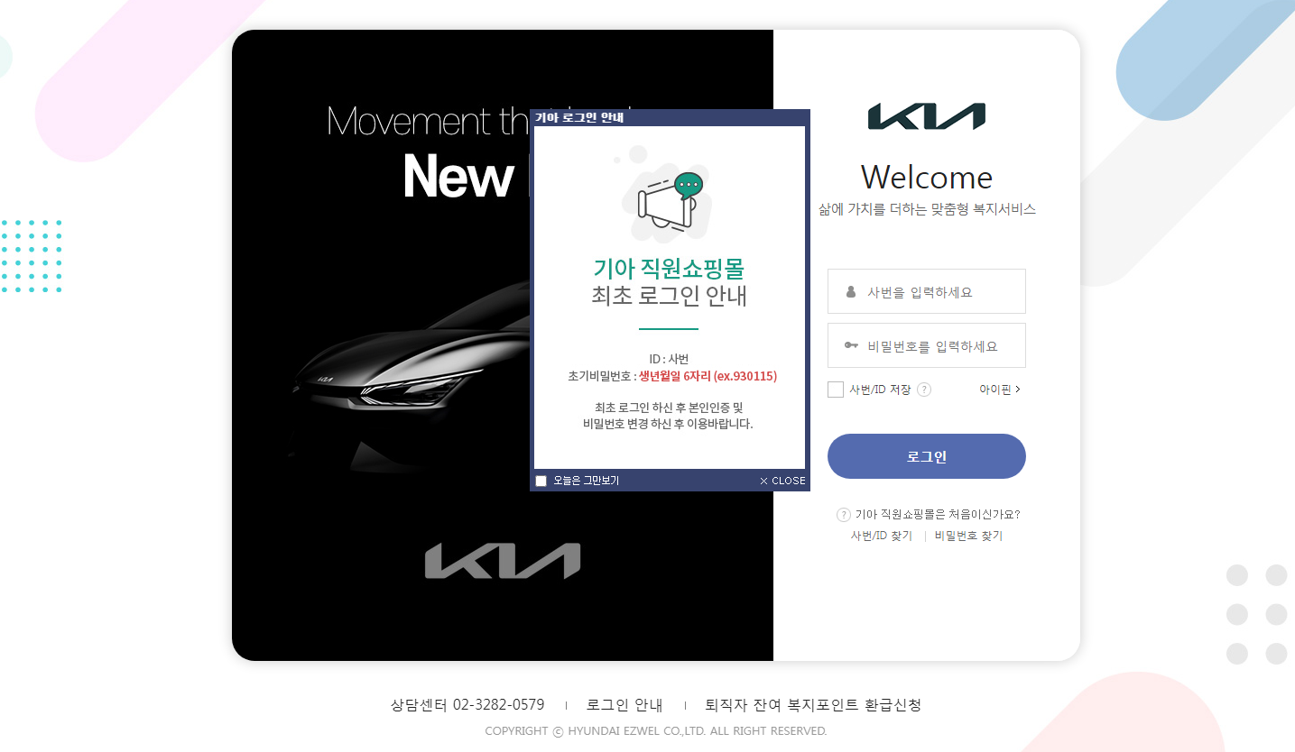 최초 로그인 임직원의 경우 ID는 사번으로 설정되어있고 , 초기 비밀번호는 생년월일 6자리 입니다. EX 930115