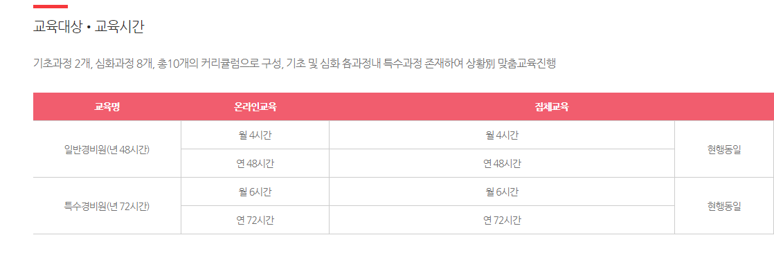 - 일반경비원 (년 48시간) - 온라인 교육 월 4시간 / 연 48시간 / 집체교육 월 4시간 연 48시간