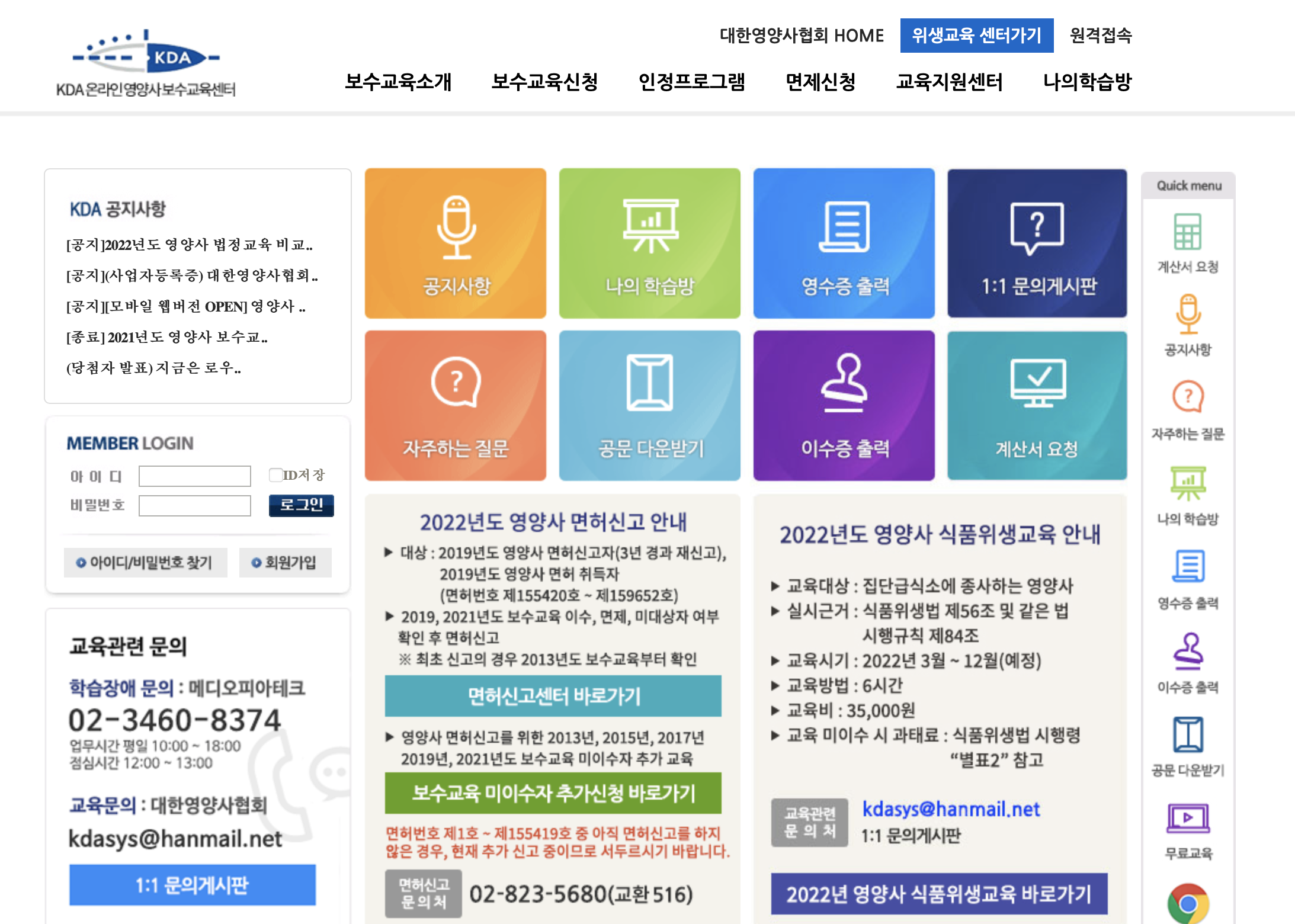 홈페이지 - KDA온라인 영양사 보수교육센터 (https://www.kdaedu.or.kr)