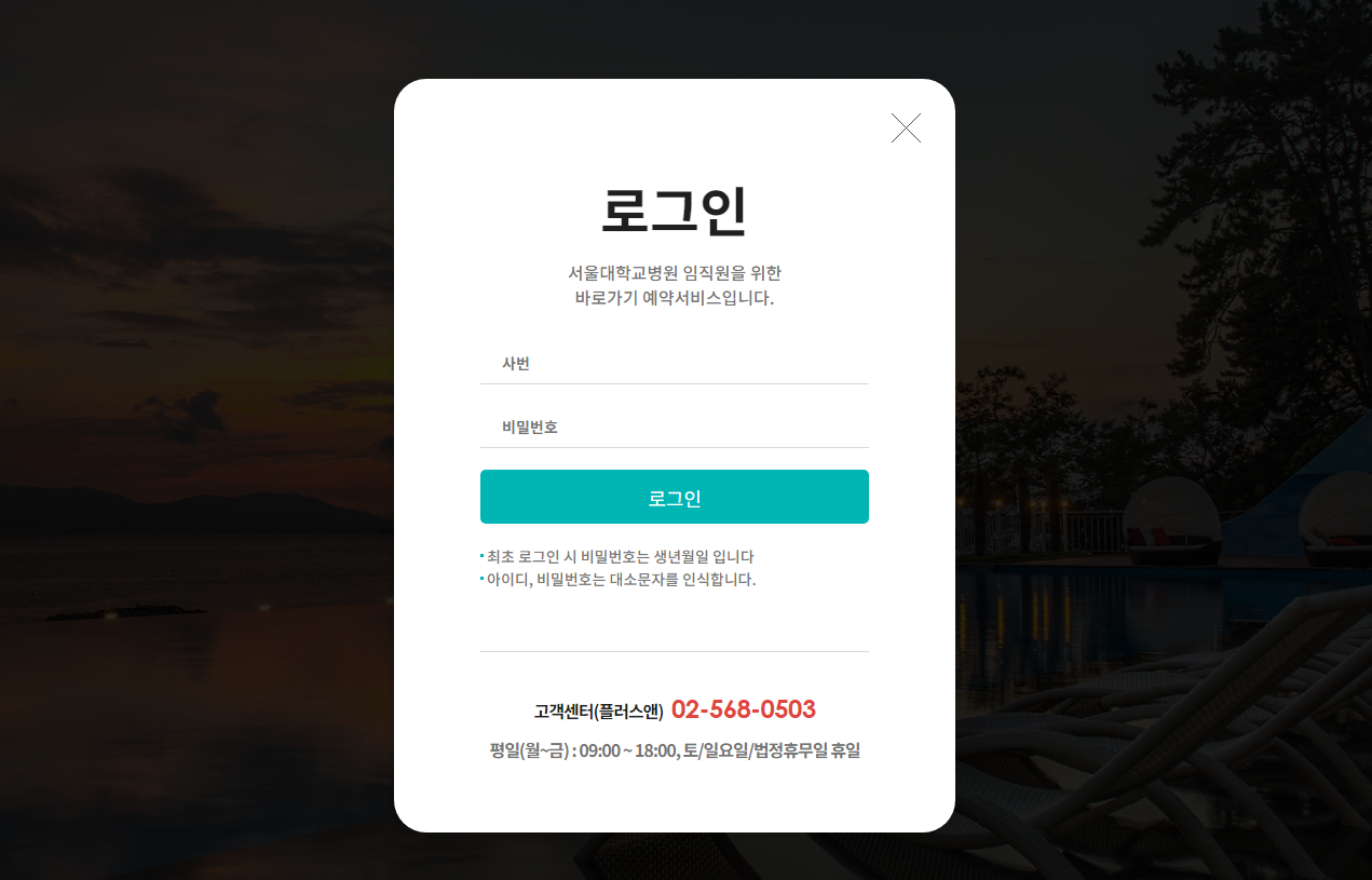 서울대학교병원 임직원을 위한 바로가기 예약 서비스 입니다.