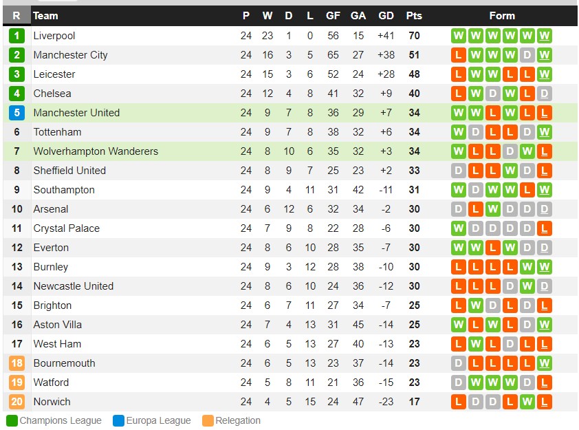 현재 리그 24라운드까지 진행된 가운데 맨유는 리그5위 울버햄튼은 승점 34점으로 맨유와 동률이지만 골득실에서 밀려 맨유와 토트넘다음 7위에 랭크되어 있습니다.