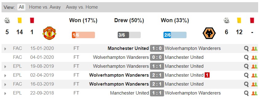 맨유와 울버햄튼의 최근 6번의 맞대결 전적을살펴보면 놀랍게도 울버햄튼이 2승 3무 1패로 우세한 상황입니다. 가장 최근에는 FA컵에서 맨유가 1-0 승리를 거두었습니다.