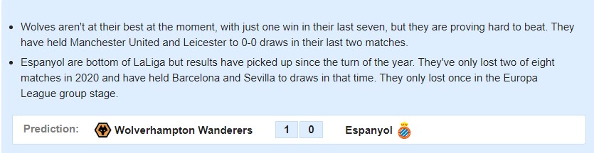 홈 울버햄튼의 1-0 혹은 2-1승리를 예상해봅니다.