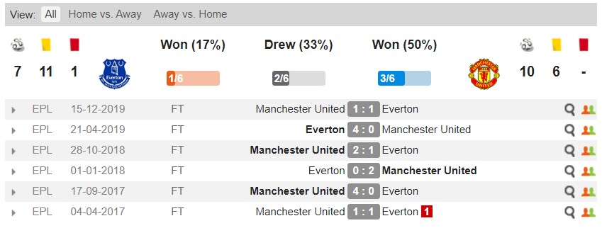 에버튼과 맨유의 상대전적 최근 6경기에서는 맨유가 3승 2무 1패로 압도하고 있습니다. 하지만 가장 최근 리그 경기에서는 1-1 무승부를 기록했고 2018-2019 시즌 4월 21일 구디슨파크에서 4-0 대패를 당한 기록이 최근입니다.
