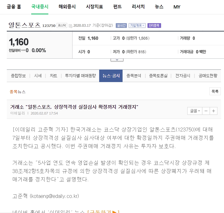 5사업 연도 연속 영업손실 발생. 코스닥 상장폐지 우려 상황이 벌어짐.