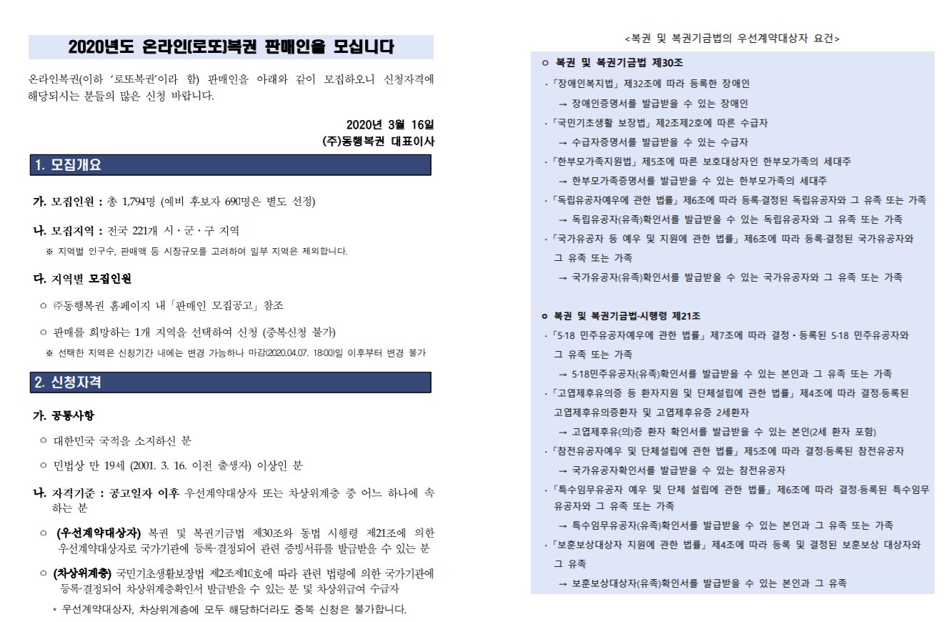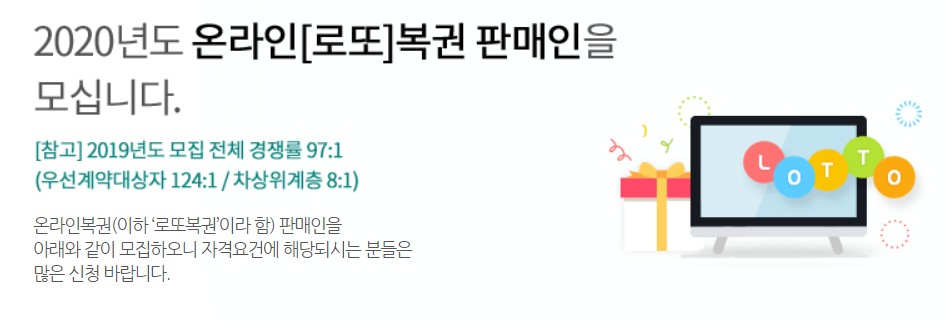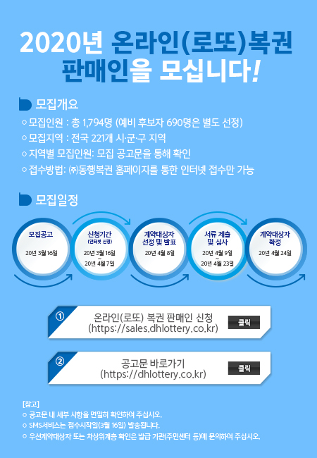 2020년 온라인(로또) 복권 판매인을 신규로 모집합니다.