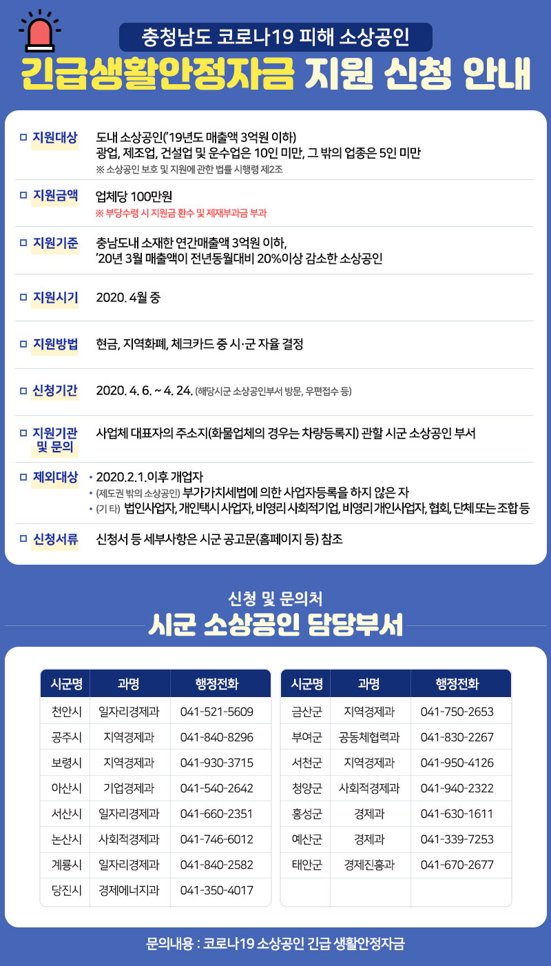 충청남도 코로나 19 피해 소상공인을 위한 긴급생활안정자금 지원 신청 안내.