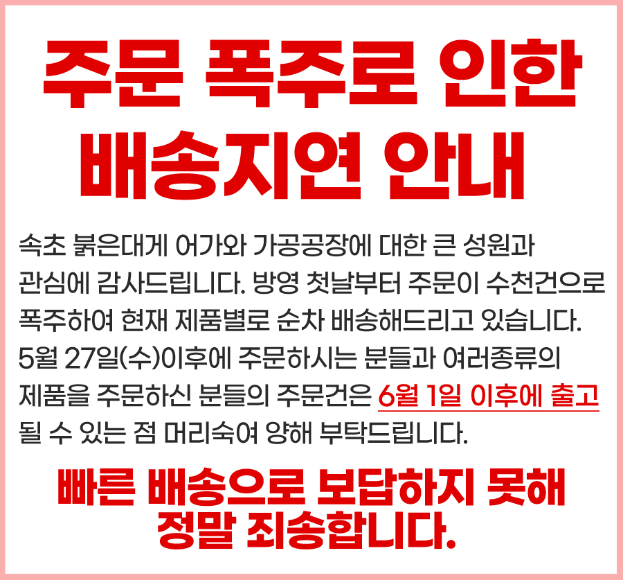 방송 후 주문이 폭주할 정도로 엄청난 인기리에 판맥 되고 있는데요, 물량은 준비가 되어있지만 주문이 폭주를 하여서 배송이 조금 지연된다고 합니다. 이 점 양지하시고 주문하시는게 좋을 듯 합니다.