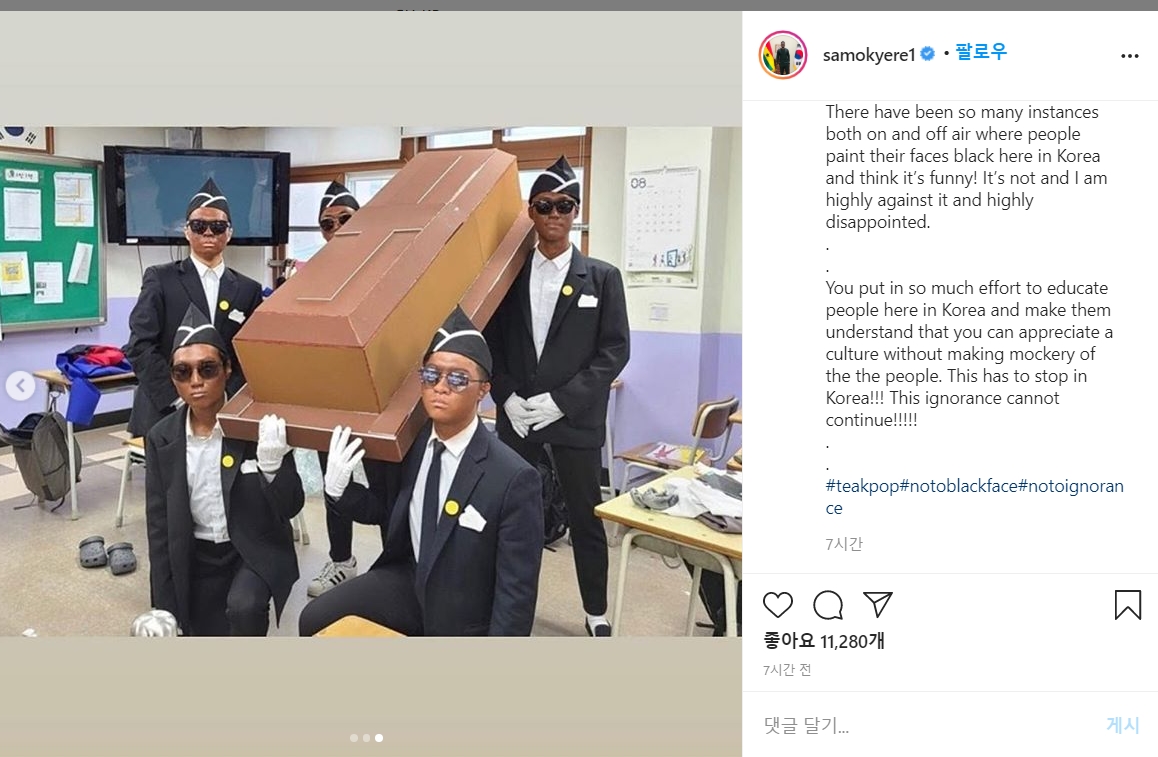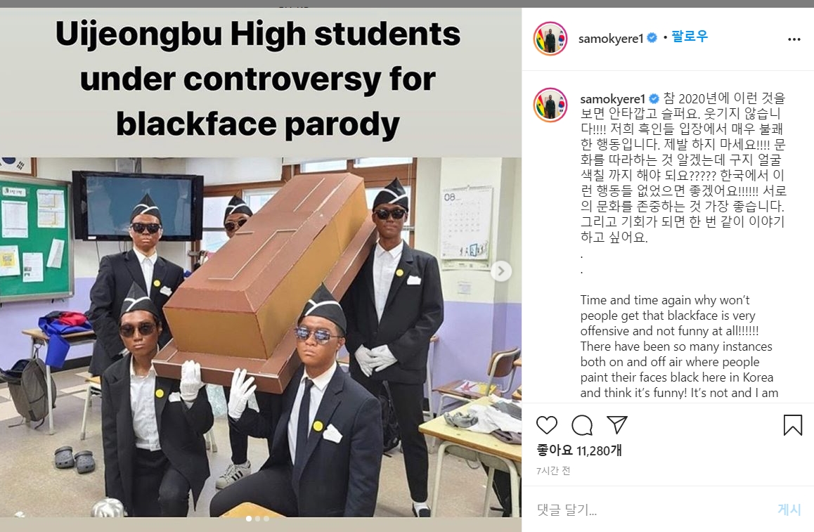 웃기지 않습니다.!!!! 저희 흑인들 입장에서 매우 불쾌한 행동입니다. 제발 하지 마세요!!!! 문화를 따라하는 것 알겠는데 구지 얼굴 색칠까지 해야 되요? 한국에서 이런 행동들 없었으면 좋겠어요 !!!!!! 서로의 문화를 존중하는 것 가장 좋습니다. 그리고 기회가 되면 한 번 같이 이야기 하고 싶어요.