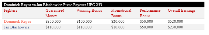 계약파이트머니 40만달러, 승리보너스 10만달러, 프로모션 보너스 3만달러, 퍼포먼스 보너스 5만달러